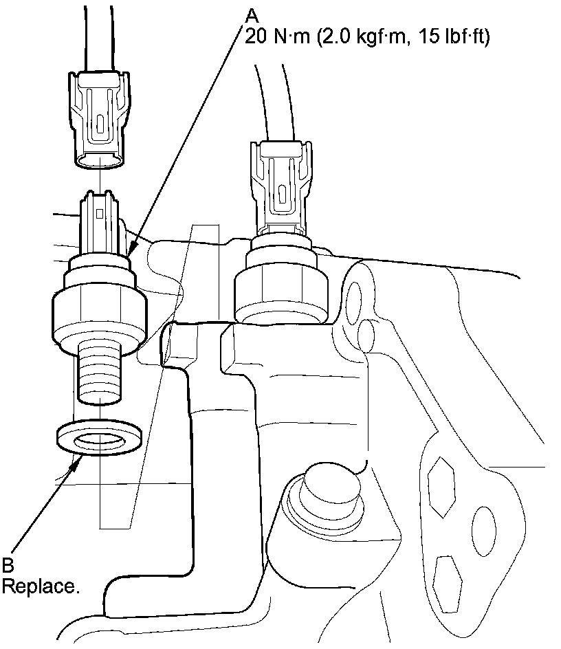 3. Disconnect the transmission fluid pressure switch A (2nd clutch) connector, and remove transmission fluid pressure switch A (2nd clutch) (A) and the sealing washer (B).