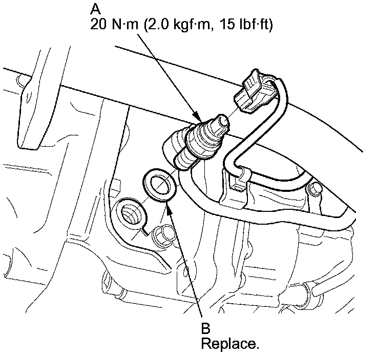 3. Disconnect the transmission fluid pressure switch C (4th clutch) connector, and remove transmission fluid pressure switch C (4th clutch) (A) and the sealing washer (B).