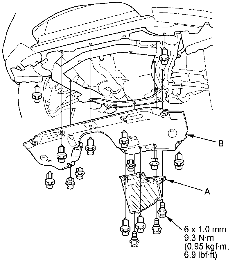 2. Remove the engine undercover (A) and the front splash shield (B).