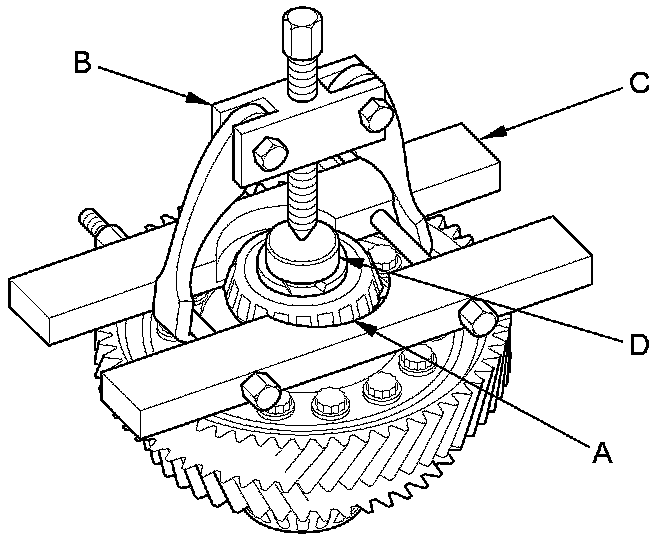 1. Remove the carrier bearing (A) using a commercially available bearing puller (B), a bearing separator (C), and a spacer (D).