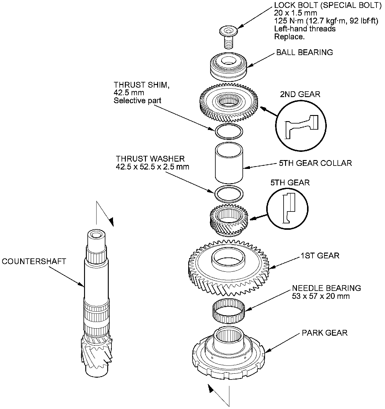 6. Check the countershaft 2nd gear axial clearance and the 5th gear axial clearance A/T Countershaft 2nd Gear and 5th Gear Axial Clearance Inspection, and check the 1st gear one-way clutch A/T Secondary Shaft 1st Gear One-Way Clutch Inspection.