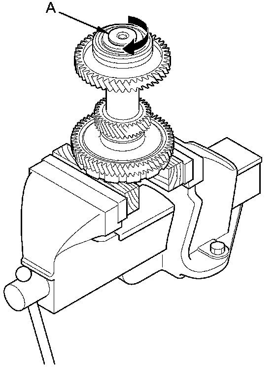 1. Secure the final drive gear part of the countershaft in a bench vise with wood blocks, loosen the lock bolt (A), and remove it. The lock bolt has left-hand threads.