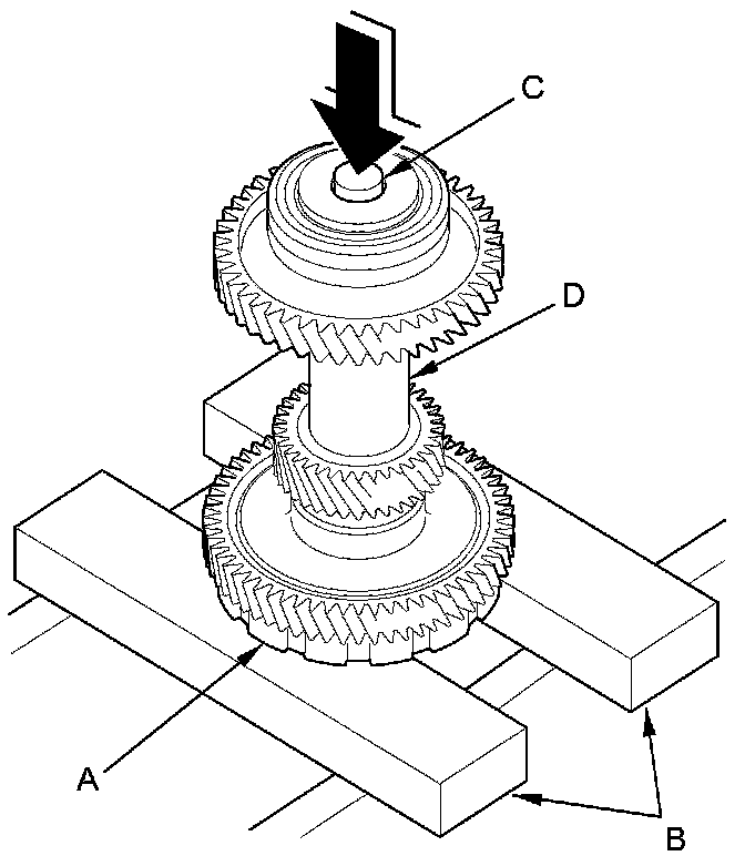 2. Place the park gear (A) on press bases (B), and place a spacer (C) between the countershaft (D) and the press to prevent damaging the countershaft.
