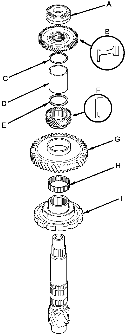 3. Remove the ball bearing (A), 2nd gear (B), the 42.5 mm thrust shim (C), the 5th gear collar (D), the 42.5 x 52.5 x 2.5 mm thrust washer (E), 5th gear (F), 1st gear (G), the 53 x 57 x 20 mm needle bearing (H), and the park gear (I) using a press.