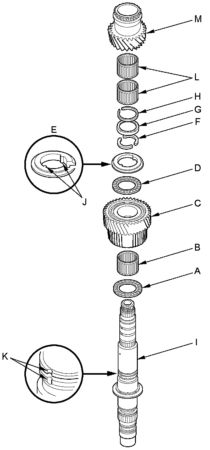 1. Install the 49 x 66 x 3 mm thrust needle bearing (A), the 45 x 50 x 25 mm needle bearing (B), 4th gear (C), the 49 x 66 x 3 mm thrust needle bearing (D), and the selected 4th gear washer (E), and install the 36 mm cotters (F), the cotter retainer (G), and the snap ring (H) on the third shaft (I). Install the 4th gear washer by aligning the fingers (J) with the grooves (K), and in the direction shown.