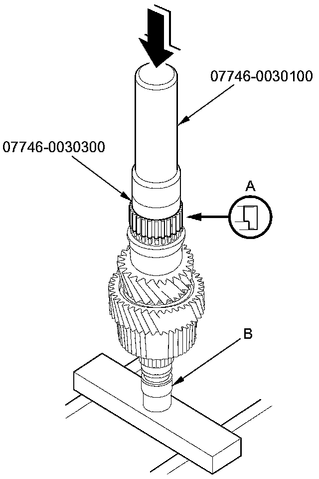3. Apply ATF to the shaft splines of the reverse selector hub contact area, then slide the reverse selector hub (A) over the third shaft (B), then press it into place using the 40 mm driver handle, the 30 mm bearing driver attachment, and a press.