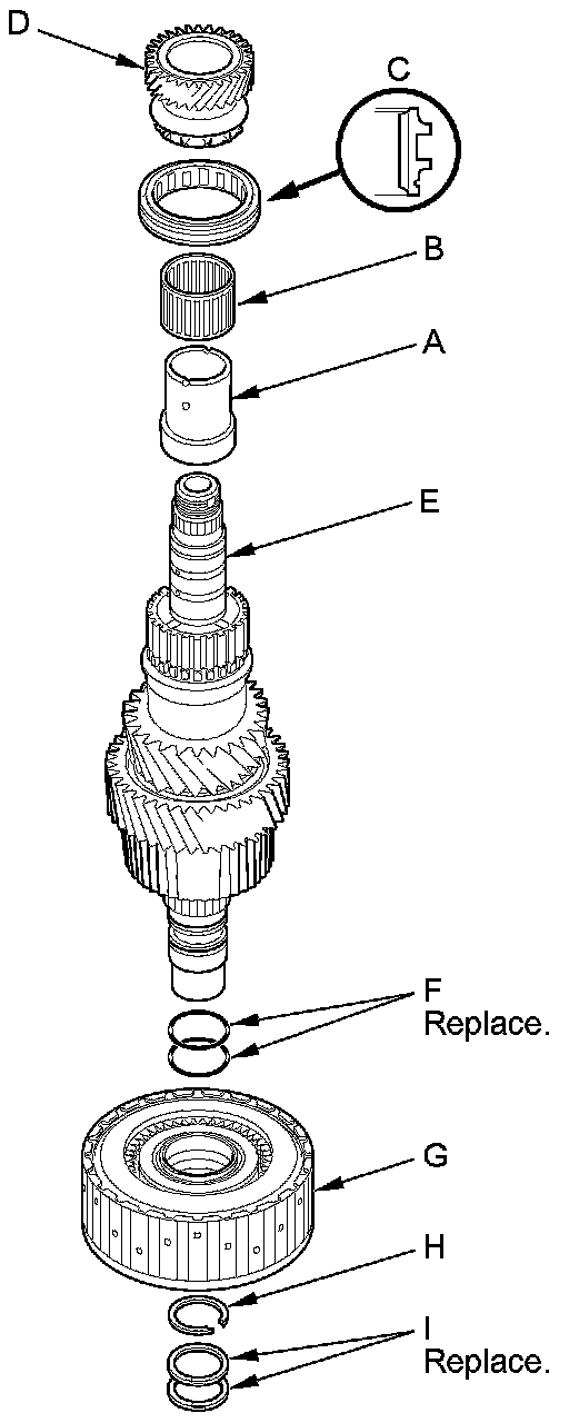 6. Install the 4th clutch (G) on the secondary shaft, and secure the 4th clutch with the 35 mm snap ring (H).