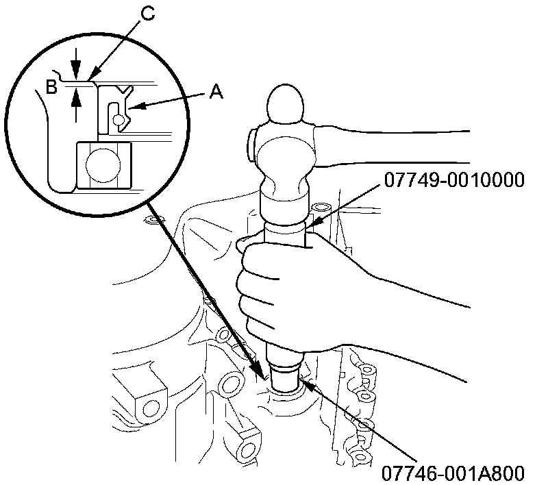 2. Install a new oil seal (A) in the transmission housing to a depth (B) of 0.3-1.0 mm (0.012-0.039 in) below the transmission housing surface (C) using the 15 x 135L driver handle and the 22 x 24 mm attachment.