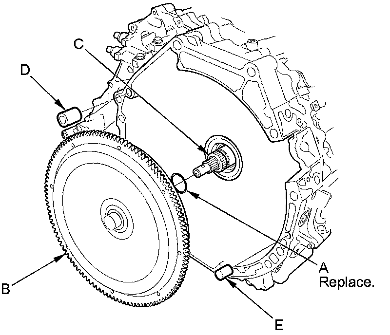 3. Install the 14 x 20 mm dowel pin (D) and the 10 x 20 mm dowel pin (E) in the torque converter housing.