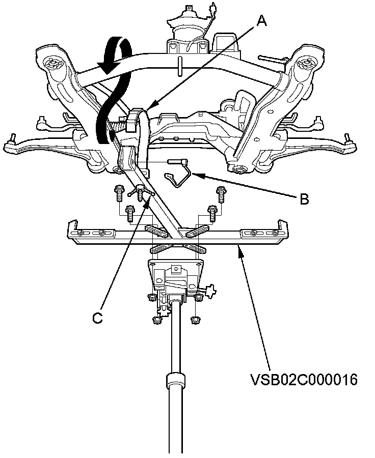 15. Set the subframe adapter (VSB02C000016) to the front subframe by looping the strap (A) over the front of the front subframe, then secure the strap with the stop (B), then tighten the wing nut (C).