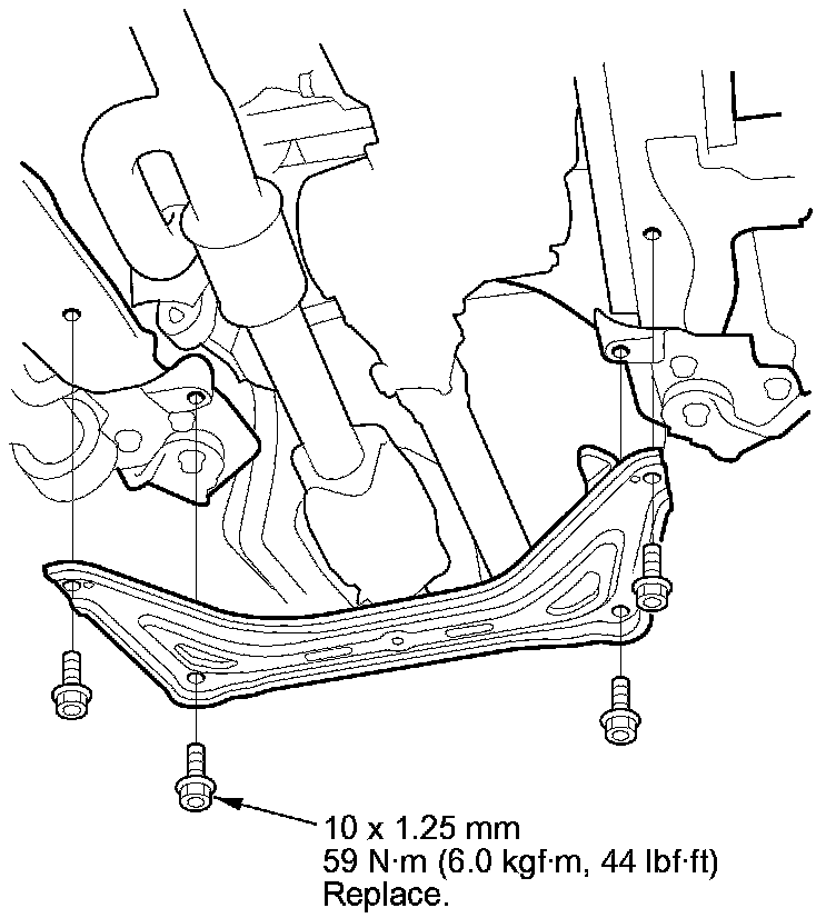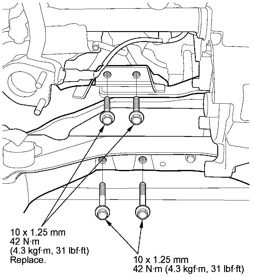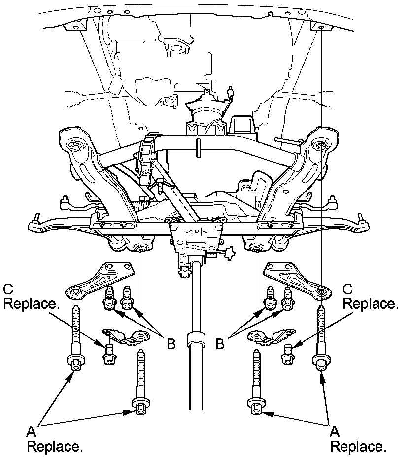 16. Raise the front subframe up to the body, then loosely install new front subframe mounting bolts (A), the front stiffener mounting bolts (B), and new rear stiffener mounting bolts (C).