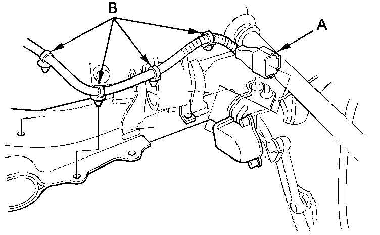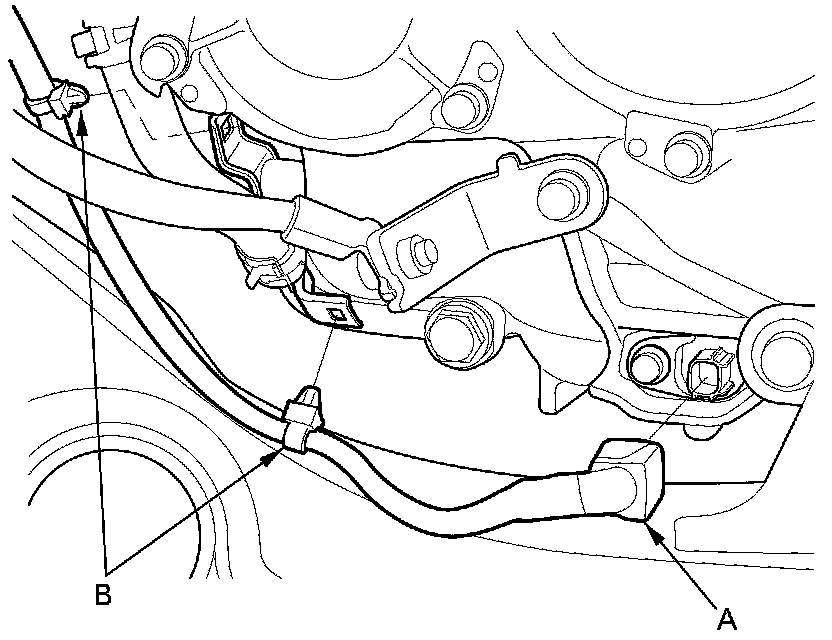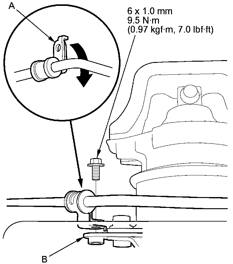 21. Turn the P/S fluid line clamp bracket (A) to seat on the rear engine mount bracket (B), and secure the bracket on the rear engine mount bracket.