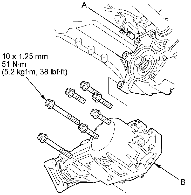 22. Attach the torque converter to the drive plate (A) with eight bolts (B). Rotate the crankshaft pulley as necessary to tighten the bolt to half of the specified torque, then to the final torque, in a crisscross pattern. After tightening the last bolt, check that the crankshaft rotates freely.