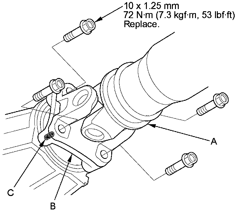 28. Install the No. 1 propeller shaft (A) to the transfer companion flange (B) by aligning the reference marks (C). Make sure you use new mounting bolts.