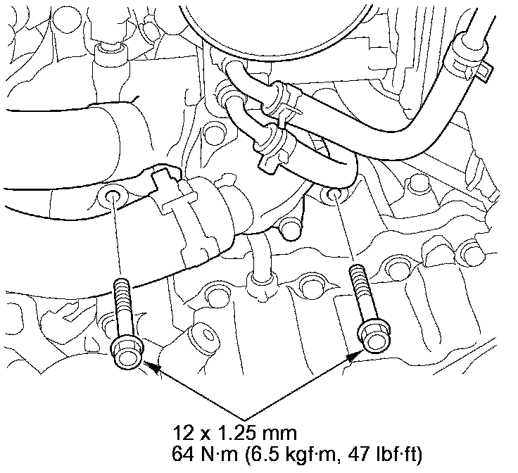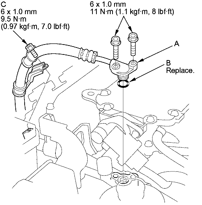 64. Install the P/S pump outlet line (A) with a new O-ring (B) to the P/S pump, and install the hose clamp bolt (C).