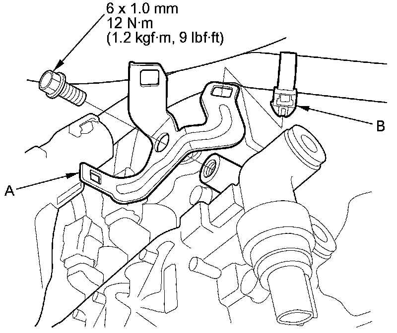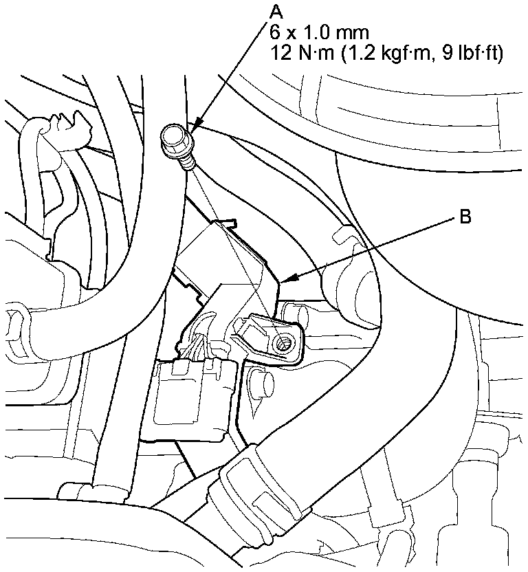 6. Connect the crankshaft position (CKP) sensor connector (A), and install the CKP sensor cover (B).