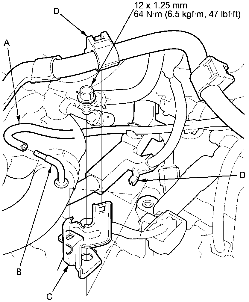 46. Connect the ATF cooler hoses (A) to the ATF cooler line (B) and the ATF filter (C), then secure the hoses with the clips (D) Service and Repair.