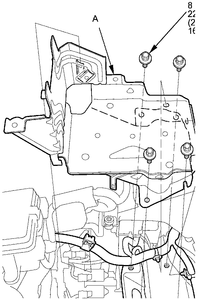 19. Install the transmission lower mount bolts (A) and the transmission ground terminal bracket (B).