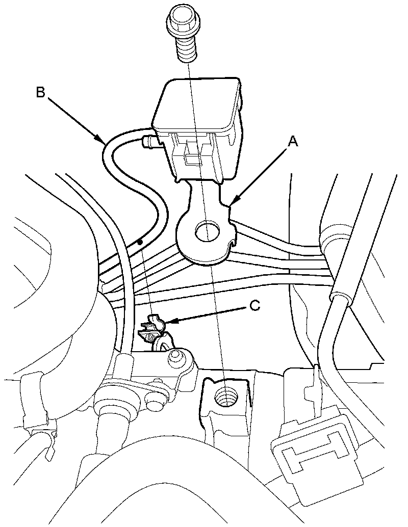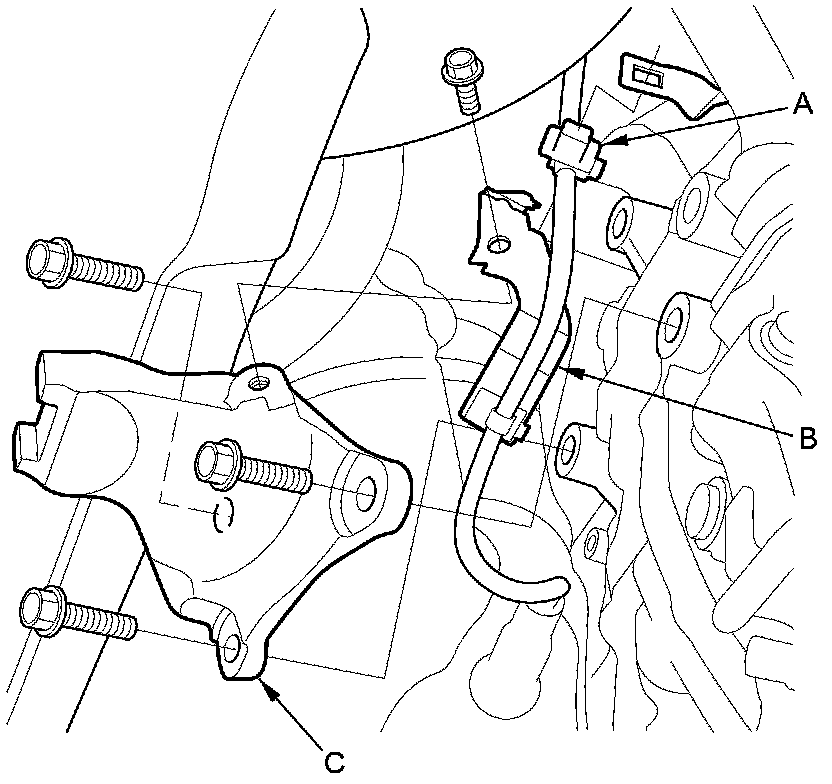 19. Remove the transfer breather box bracket (A), and remove the breather hose (B) from the clamp (C).