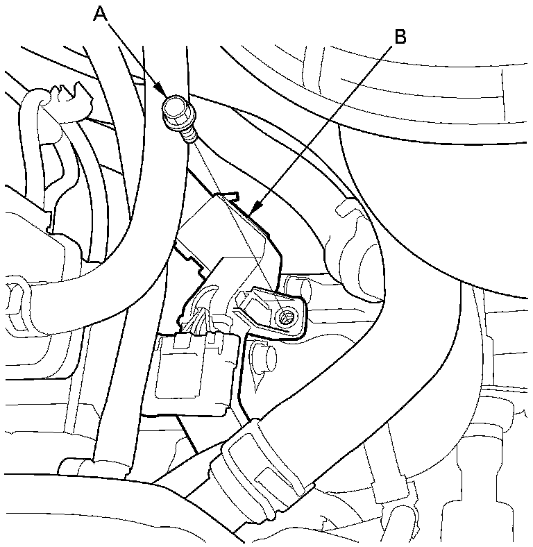 16. Cover the auto-tensioner, the alternator, the A/C compressor with several shop towels to protect them from spilled power steering (P/S) fluid. Remove the P/S pump outlet line (A) from the P/S pump, and remove the hose clamp bolt (B). Cover the opening of the pump and the pump outlet line with a piece of tape to prevent foreign material from entering either the pump or the outlet line. Take care not to spill fluid on the vehicle. Wipe off any spilled fluid at once.