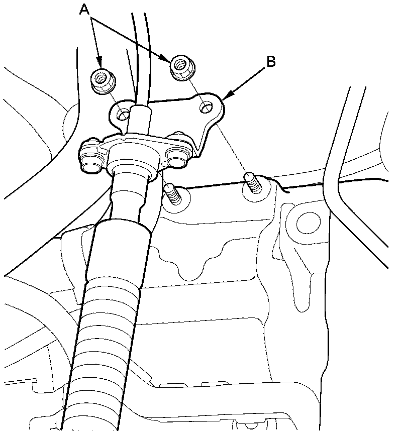 25. Remove the nuts (A) securing the shift cable bracket (B).