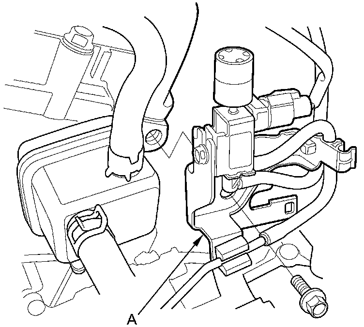 35. Remove the engine mount control solenoid valve bracket (A) from the rear cylinder head; use the bracket bolt hole to attach the engine hanger balance bar rear arm.