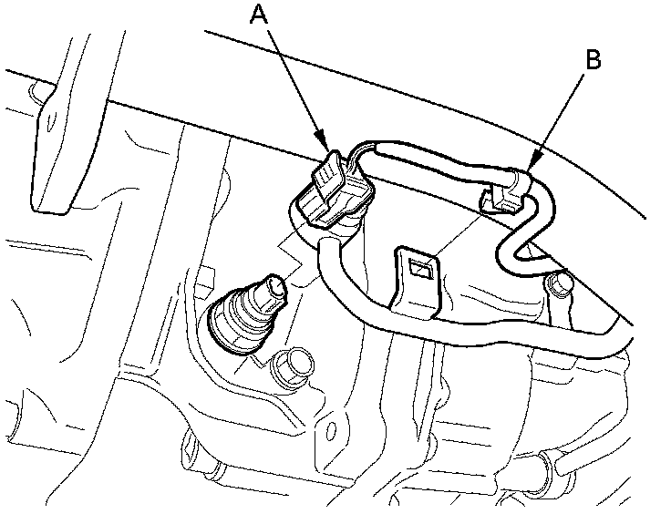 46. Disconnect the ATF temperature sensor connector (A), then remove the harness clamps (B).