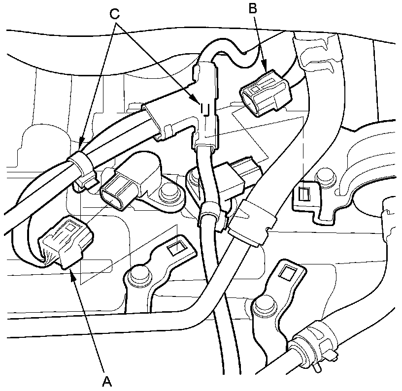 48. Disconnect the input shaft (mainshaft) speed sensor connector (A) and the output shaft (countershaft) speed sensor connector (B), then remove the harness clamps (C).