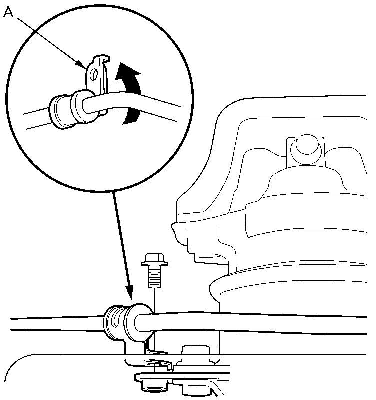 63. Remove the bolt securing the P/S fluid line clamp bracket (A) on the rear engine mount bracket, and turn the bracket away from the rear engine mount bracket.