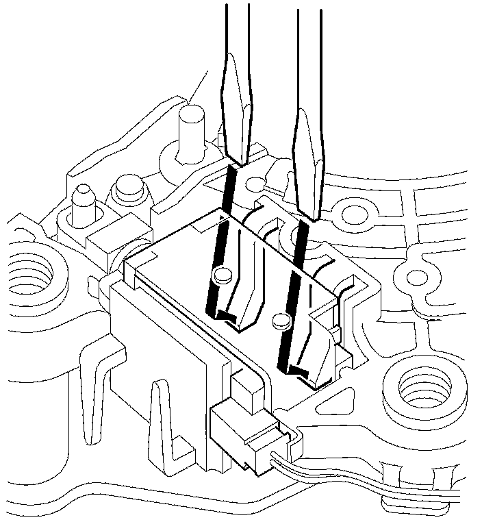 4. Release the lock tabs retaining the shift lock solenoid using thin-bladed screwdrivers.
