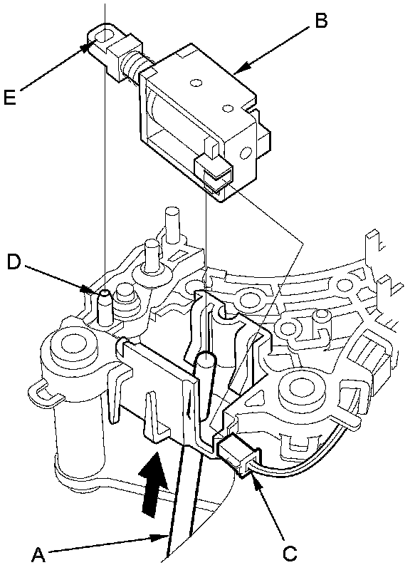 6. Disconnect the shift lock solenoid connector (C), and replace the shift lock solenoid.