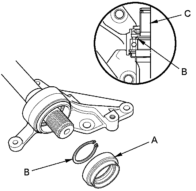 2. Remove the outer seal (A) and the external snap ring (B) from the intermediate shaft (C).