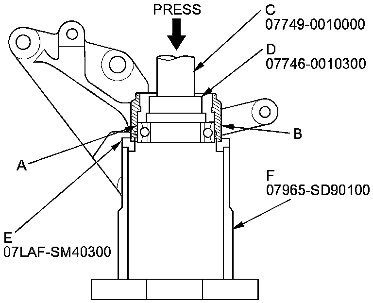 5. Press the intermediate shaft bearing (A) out of the bearing support (B) using the 15 x 135L driver handle (C), the 42 x 47 mm bearing driver attachment (D), the support base attachment (E), the support base (F), and a press.