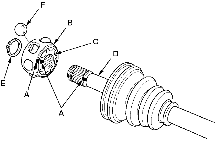 3. Make marks (B) on the bearing retainer (C) and the inboard joint (D) to identify the locations of the bearing retainer to the grooves in the inboard joint. Then remove the inboard joint on a clean shop towel (E). Be careful not to drop the steel balls when separating them from the inboard joint.