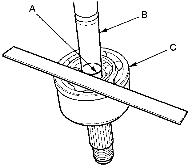 4. Make a mark (A) on the driveshaft (B) at the same level as the outboard joint end (C).