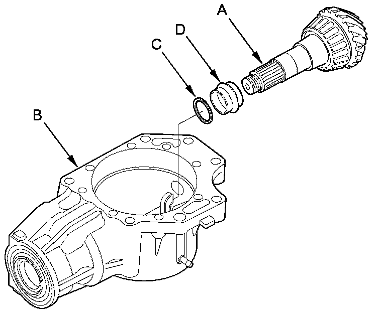 11. Remove the transfer output shaft (hypoid gear) (A) from the transfer housing (B), then remove the thrust washer (C) and the transfer spacer (D) from the transfer output shaft (hypoid gear).