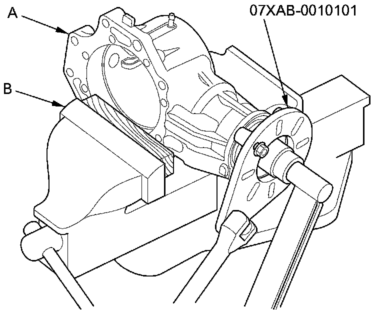 7. Secure the transfer housing (A) in a bench vise (B) with wood blocks.