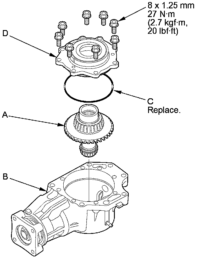 23. Install a new O-ring (C) on the transfer cover (D), then install the transfer cover on the transfer housing.