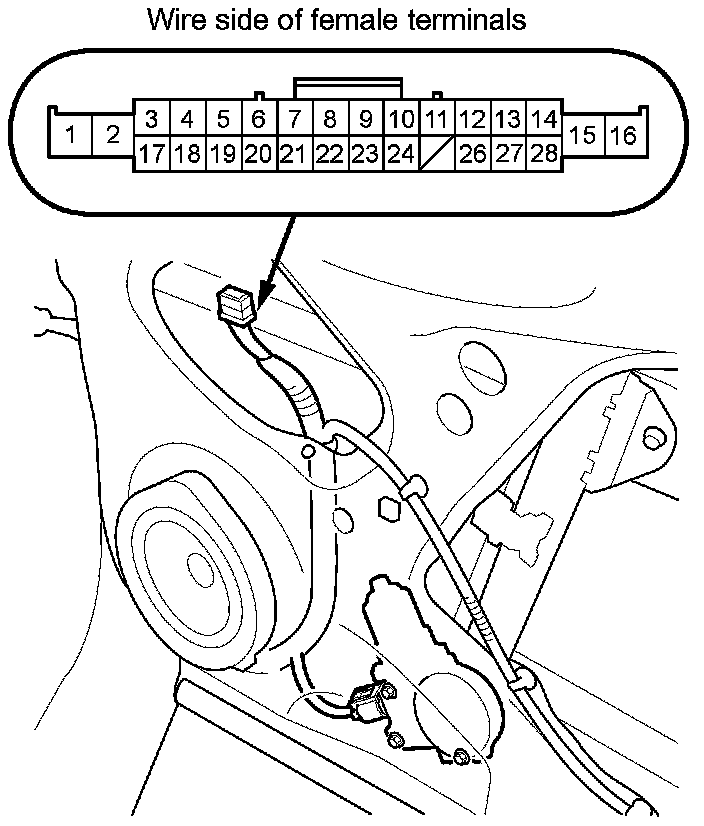 2. At the front passenger's door wire harness 28P connector, test the front passenger's power window motor in each direction by connecting battery power and ground according to the table. When the motor stops running, disconnect one lead immediately.