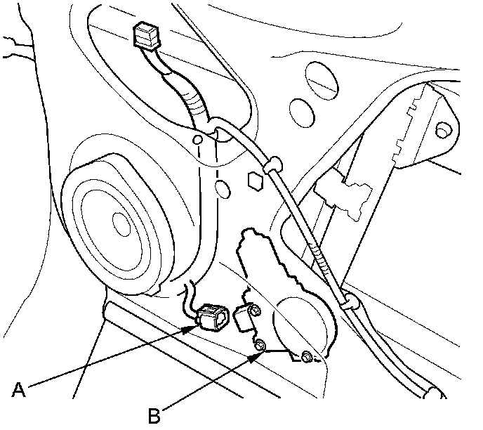 4. Disconnect the 6P connector (A) from the front passenger's power window motor (B).