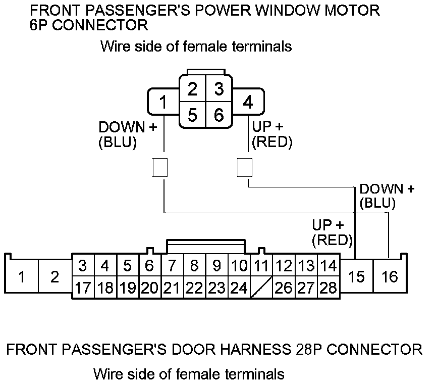5. Check for continuity between front passenger's door harness 28P connector terminals No. 15 and No. 16, and front passenger's power window motor 6P connector terminals No. 1 and No. 4 respectively. There should be continuity.