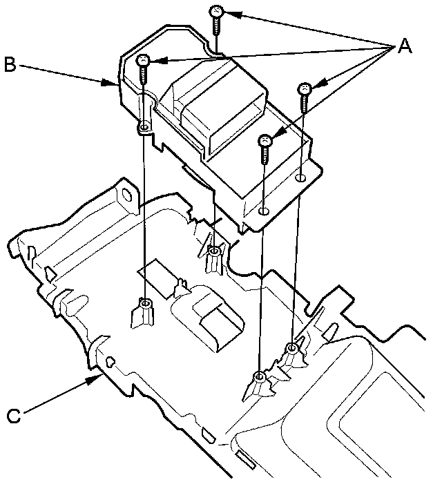 2. Remove the four screws (A), then remove the front passenger's power window switch (B) from the power window switch panel assembly (C).