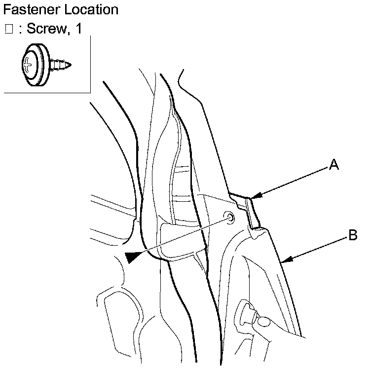 2. Remove the screw securing the door glass outer weatherstrip (A) from the front edge of the door (B).