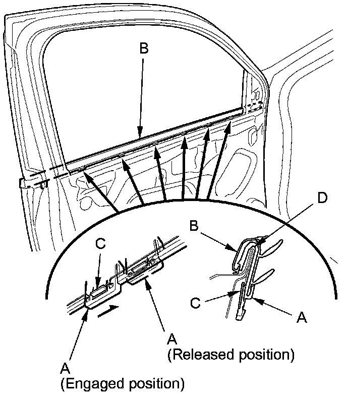 3. From the inside of the door, slide the clips (A) on the door glass outer weatherstrip (B) to release the hooks (C) from the flanges (D) on the door.