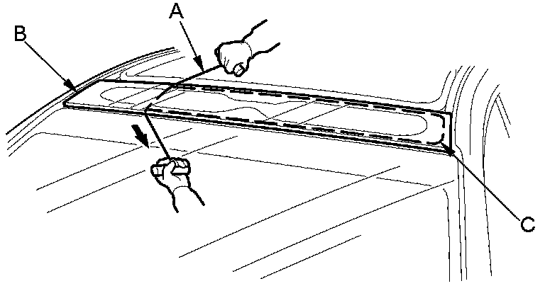 5. With a helper, pull the piano wire (A) back and forth in a sawing motion. Hold the piano wire as close to the front fixed glass panel (B) as possible to prevent damage to the body. Carefully cut through the adhesive (C) around the entire panel.