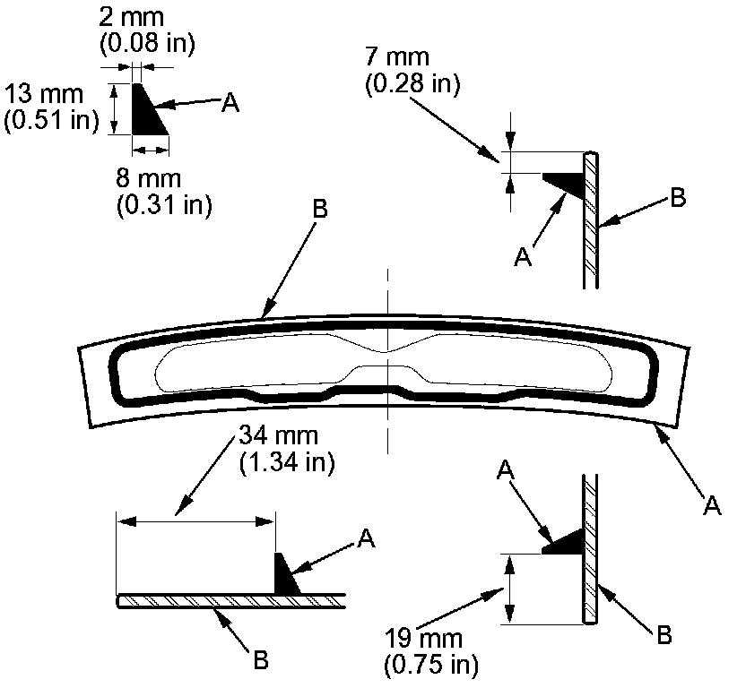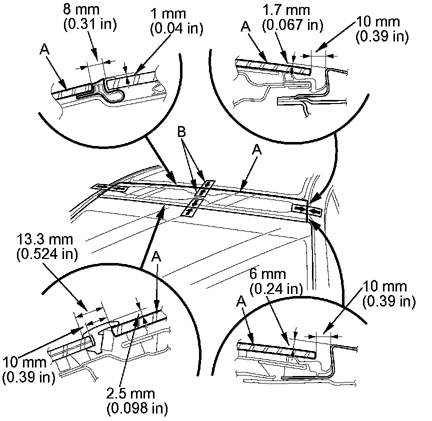 16. Pack adhesive into the cartridge without air pockets to ensure continuous delivery. Put the cartridge in a caulking gun, and run a bead of adhesive (A) along the edge of the front fixed glass panel (B) as shown or along the old adhesive path on the housing. Apply the adhesive within 30 minutes after applying the glass primer. Make a slightly thicker bead at each corner.