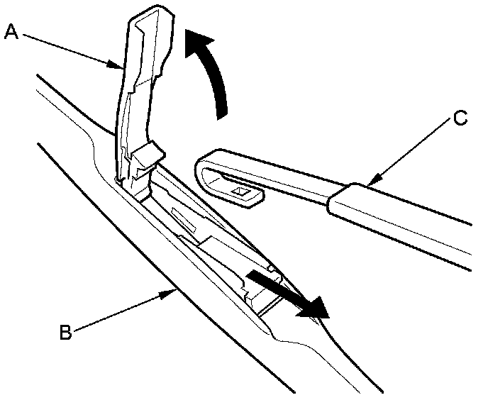 2. Pull up and hold the tab (A) and slide the wiper holder (B) toward the tab to release it from the wiper arm (C).