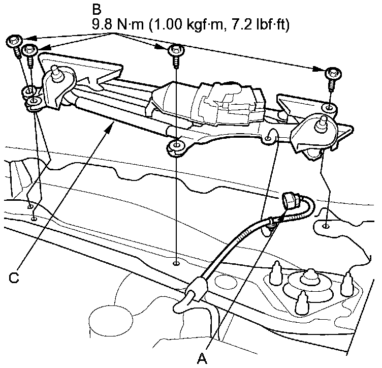 4. Remove the four bolts (B) and the wiper linkage assembly (C).