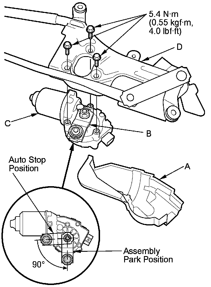 7. Remove the cover (A), rotate the link (B) 90° to the "Assembly Park Position", then remove the three bolts, and separate the motor (C) from the linkage (D).