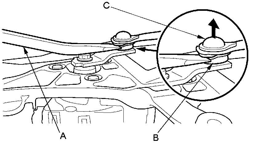Be careful not to damage the rubber (B) and the linkage (C) with pry bar.